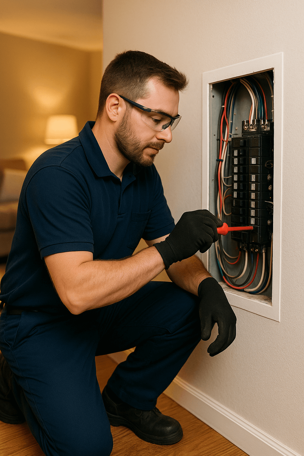 Licensed electricians provide a wide range of services including electrical repairs, panel upgrades, wiring installation, lighting installation, outlet and switch replacement, circuit troubleshooting, and electrical safety inspections for residential and commercial properties.